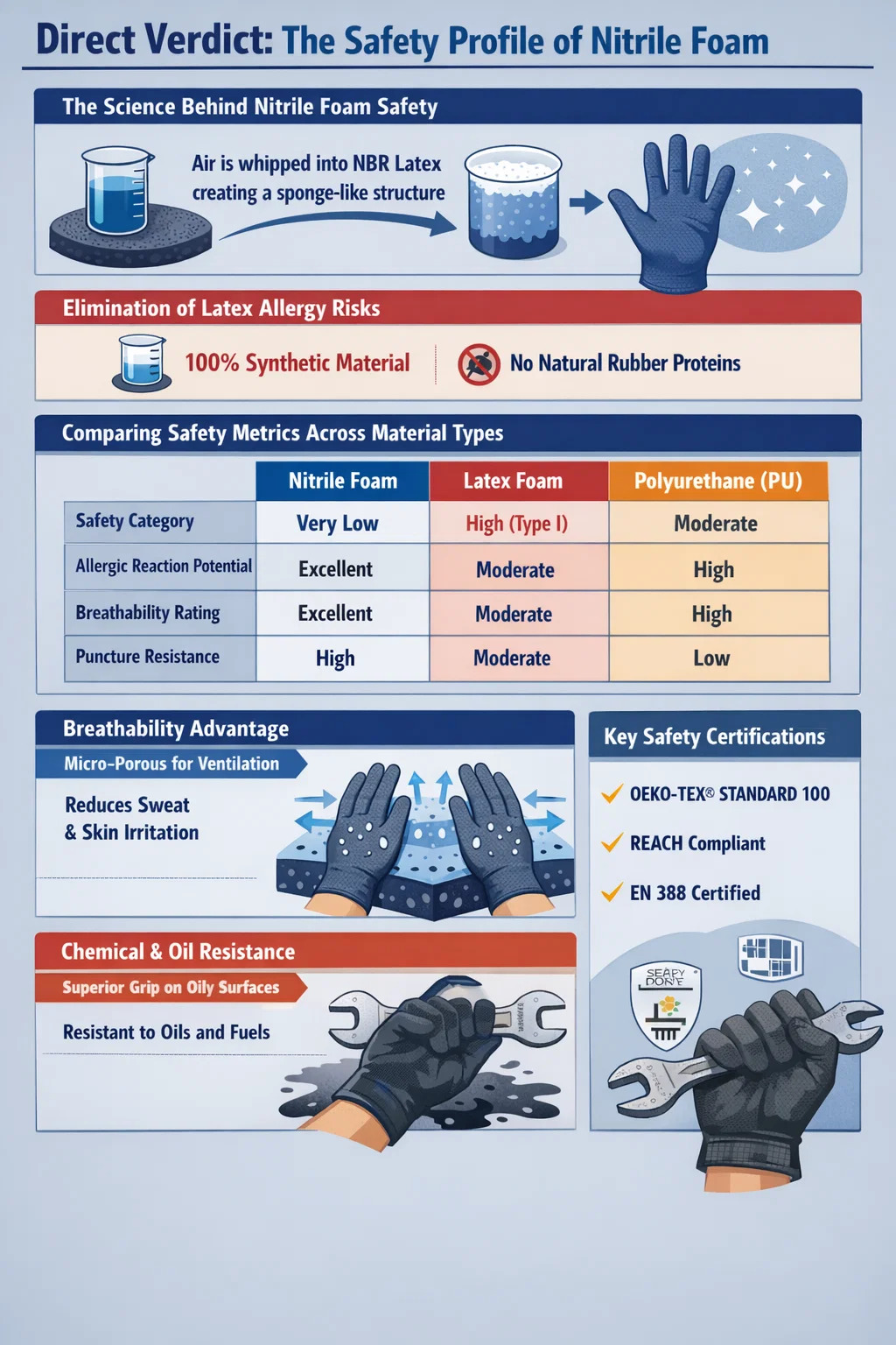 Pag-unawa sa kaligtasan ng nitrile foam Nangangailangan ng paghahambing sa iba pang karaniwang coating na materyales tulad ng Polyurethane (PU) o Latex. Itinatampok ng talahanayan sa ibaba kung paano namumukod-tangi ang nitrile sa mga tuntunin ng kalusugan at proteksyon ng user.