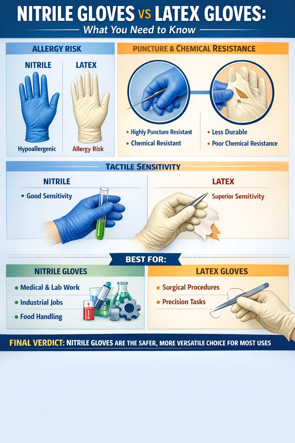 Para sa pangkalahatang layuning paggamit — paglilinis, paghahanda ng pagkain, pangangalaga sa pasyente, phlebotomy, paghawak ng ispesimen — ang nitrile ay nagbibigay ng ganap na sapat na pandamdam na feedback habang naghahatid ng higit na mahusay na proteksyon at inaalis ang panganib sa allergy.