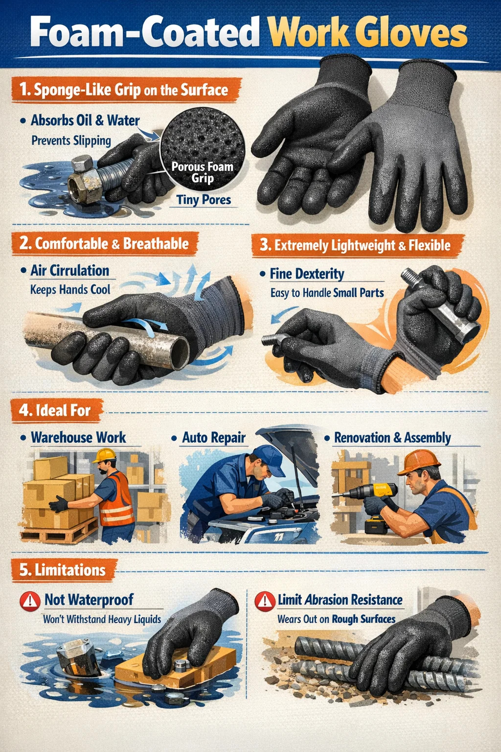 Mga guwantes na foam hindi ibig sabihin na ang buong glove ay gawa sa foam; sa halip, ang mga ito ay tumutukoy sa mga regular na guwantes na tela na pinahiran ng isang espesyal na ginagamot na layer ng goma o polimer na naglalaman ng maliliit na butas.
