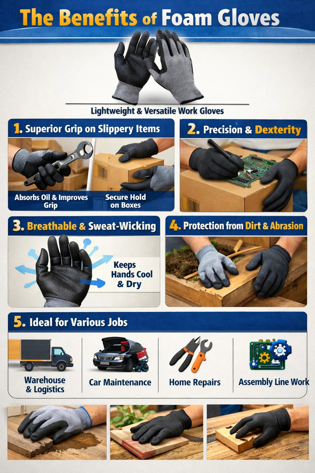 Breathable at Sweat-wicking: Dahil tinatawag itong "foamed," hindi solid block ang coating. Maaaring dumaan ang hangin sa maliliit na butas na hindi nakikita ng mata, na ginagawa itong mas makahinga kaysa sa mga purong guwantes na goma. Pagkatapos ng isang hapong trabaho, ang iyong mga palad ay hindi magiging ganap na tuyo, ngunit hindi bababa sa hindi sila malagkit.