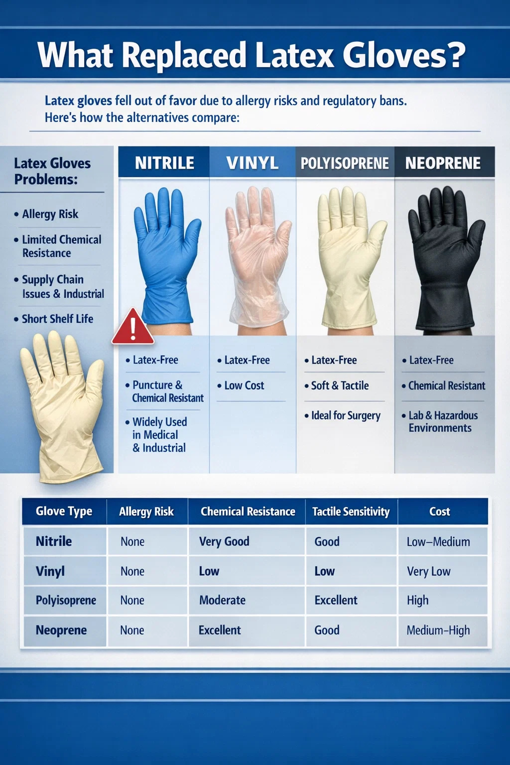 Sabi nga, hindi lang nitrile ang kapalit. Ang vinyl, neoprene, polyisoprene, at hybrid polymer gloves ay sumasakop sa mga partikular na niches depende sa gawain, kinakailangang sensitivity, mga pangangailangan sa paglaban sa kemikal, at badyet. Ang artikulong ito ay naglalakbay sa lahat ng mga ito nang detalyado — nagpapaliwanag kung bakit nangyari ang paglipat mula sa latex, kung ano ang inaalok ng mga alternatibo, at kung paano pumili ng tama para sa iyong partikular na kaso ng paggamit.