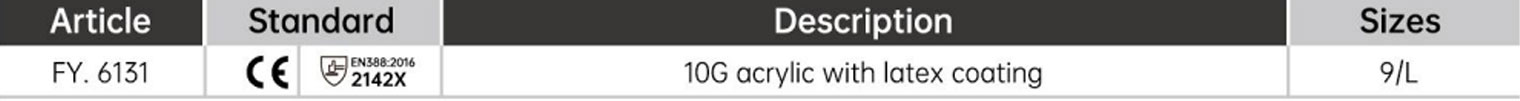 Tolerance ng temperatura: Ang latex coating ay nananatiling nababaluktot sa banayad hanggang katamtaman na temperatura at hindi magpapatigas o mag -crack, tinitiyak ang ginhawa sa panahon ng patuloy na trabaho. Ang Jiangsu Fanya Labor Protective Products Co, Ltd ay sumasailalim sa isang mahigpit na proseso ng sertipikasyon sa internasyonal upang matiyak na ang mga pakinabang na ito ay maaasahang ipinapakita sa mga aplikasyon ng real-world, sa gayon pinalakas ang reputasyon sa merkado ng kumpanya.